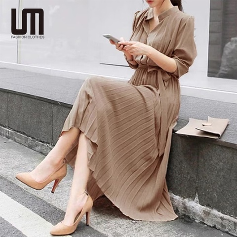 Liu Ming新製品2025カジュアルハーフスリーブ無地シフォン長袖プリーツドレス女性用