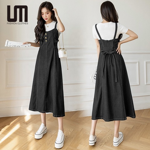 劉明韓国ファッション春夏女性SカジュアルノースリーブデニムハイウエストAラインジーンズドレス